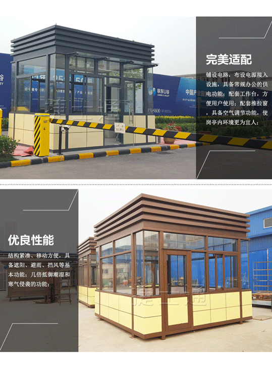 鋼結(jié)構(gòu)崗亭是全鋼結(jié)構(gòu)制作的。節(jié)能燈、開關(guān)、插座、暗敷線路、工作臺等是它的標準配置,可以預留網(wǎng)線和電話線插座。