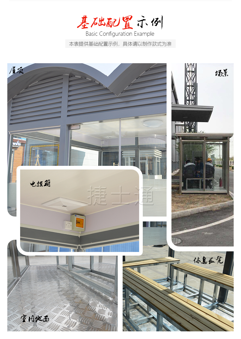 標(biāo)準(zhǔn)配置:屋頂鍍鋅板靜電噴涂,PVC吊頂,墻體玻璃材質(zhì)(鋼化、中空、有色玻璃可定制),電箱、開關(guān)、插座、暗敷電線、照明燈、煙灰缸等。可加配:空調(diào)等。