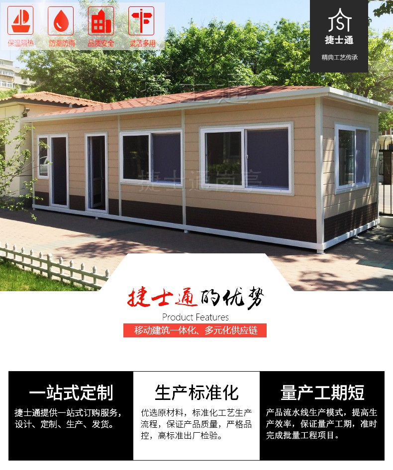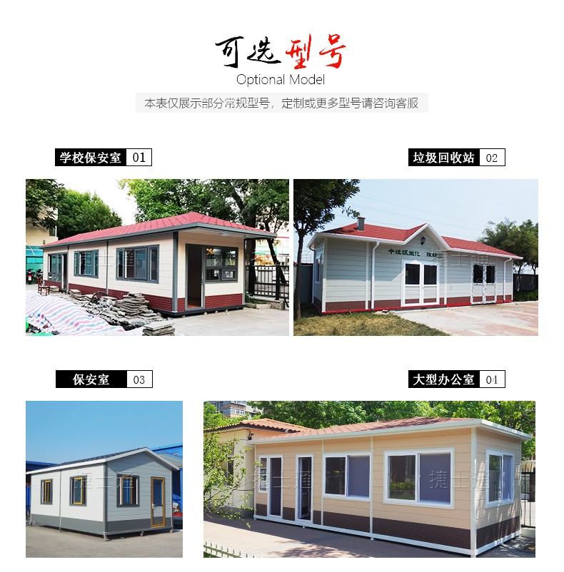 其他標(biāo)準(zhǔn)配置:墻體含保溫材料,外墻浮法玻璃,屋頂鍍鋅板靜電噴涂,PVC吊頂,地板可定做防滑鋁板/復(fù)合木地板,墻體玻璃材質(zhì):鋼化、中空、有色玻璃等可定做,電箱、開(kāi)關(guān)、插座、暗敷電線、照明燈、桌面、抽屜、鍵盤托、空調(diào)架等。聯(lián)系電話:15822882616,公司網(wǎng)址:m.wagerqb.com