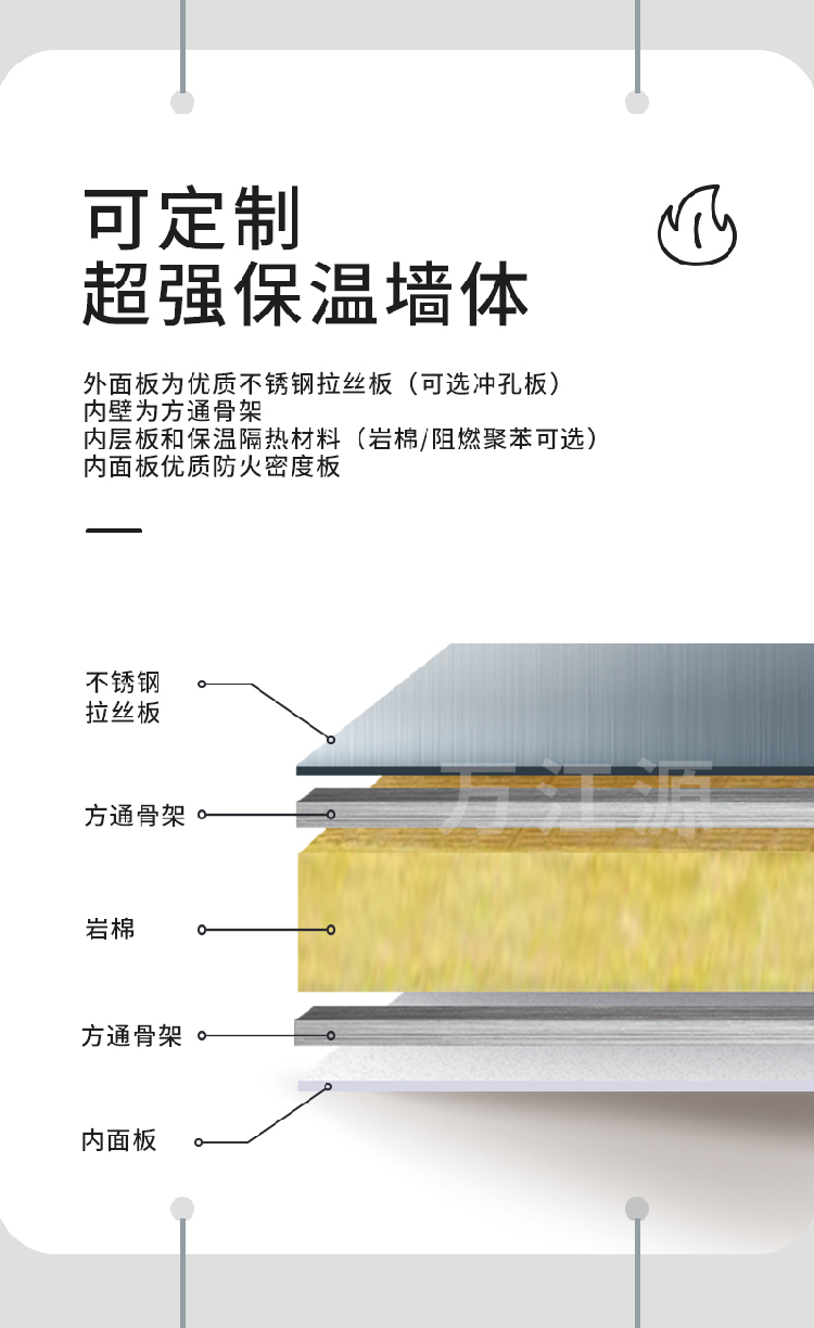 四、保溫好:這個(gè)方面是許多廠家不注重的,南方溫度較為適宜,因此不需要用到保溫,但是北方來(lái)說(shuō),保溫是必須要有的,北方冬天平均氣溫都在零度或者零下,因此保溫層和墻體厚度一般是80-100mm左右,保溫材料一般使用巖棉、擠塑板等。