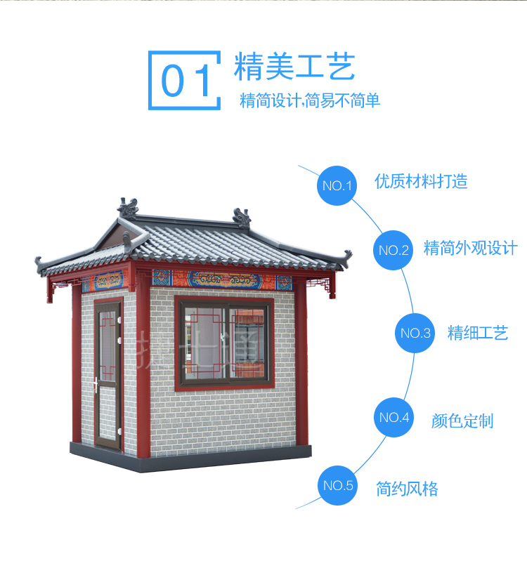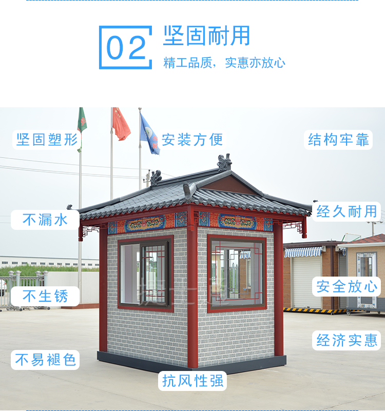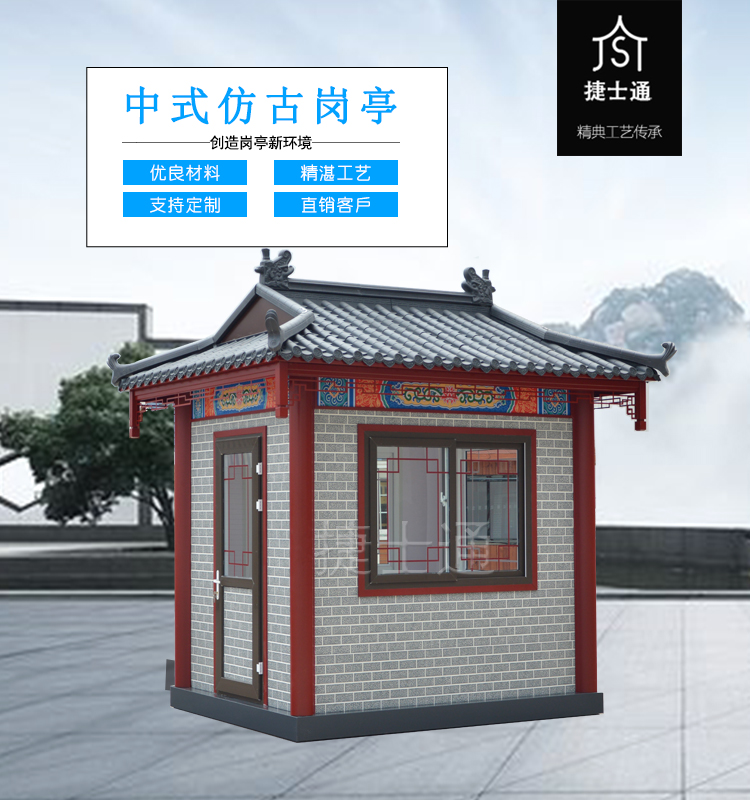 特有的造型,仿古的花紋,創(chuàng)意的窗飾,與古建筑恰到好處的融合,仿古的景區(qū)、仿古的公園、仿古的景點,保安崗亭、售票亭、休息亭均可采用此類風格,而且在設計的時候,尺寸均可定制?。。?!運輸怎么解決?捷士通廠家和全國的物流均有合作,所以只要您在中國,均可運輸?shù)剑。?br />
